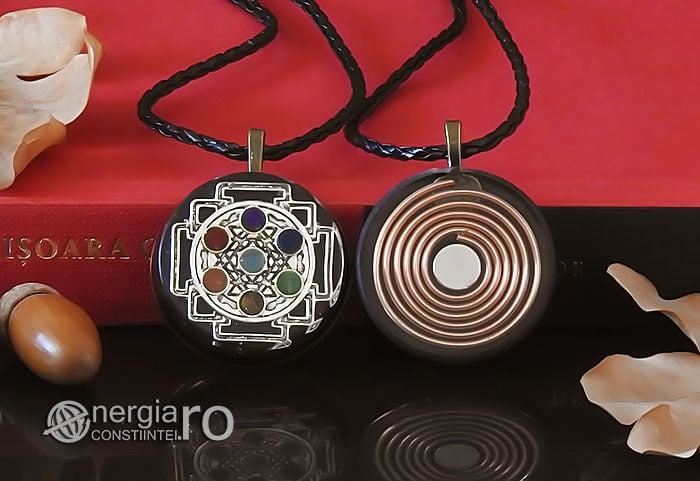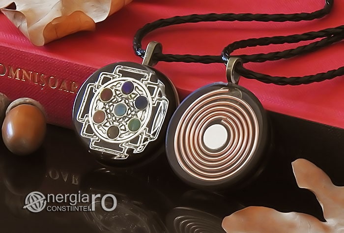 Pandantiv Orgonic Protector, Orgon Magnetic pentru Protecție Sri Yantra Șapte Chakre cu Șapte Cristale Semiprețioase, Spirală de Cupru și Amestec de Cenușă Vulcanică și Turmalină – cod ORG130