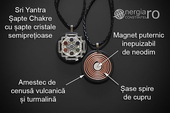 Elemente conținute: Sri Yantra, spirală cupru, cenușă vulcanică, turmalină, magnet din neodim, cristal de stâncă, ametist, lapis lazuli, jad verde, ochi de tigru, cristal roz, carneol